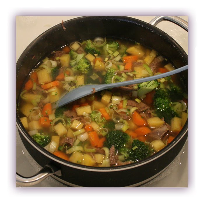 I dag har jeg laget fersk suppe med mye grønnsaker/grønnsakssuppe med litt kjøtt. Ca 400 gr bog fra elg, og massevis med grønnsaker. Dette burde bli 5 porsjoner.
